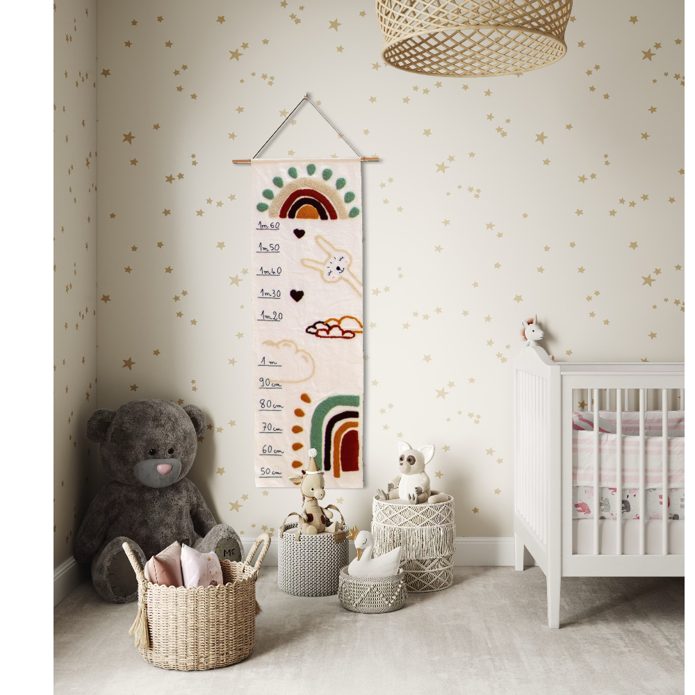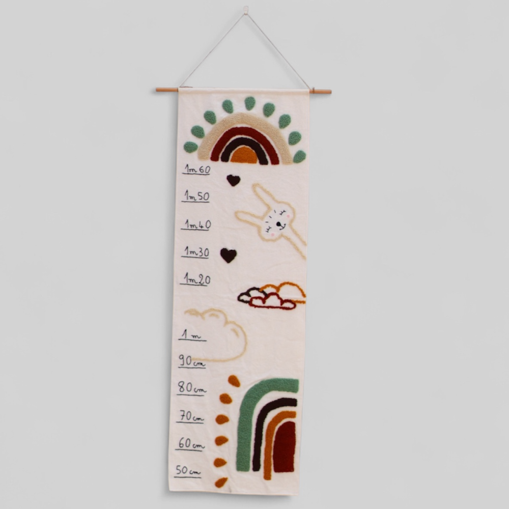 Cette toise murale décorative est parfaite pour la chambre des petits. Conçue en tissu doux et durable, elle combine praticité et décoration grâce à ses jolis motifs d’arc-en-ciel, de nuages et de lapin souriant.