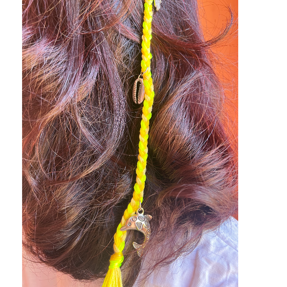 Apportez éclat et originalité à vos coiffures avec notre barrette cheveux tribal berbère Tamazight Jaune.Composée de tresses ornées de charms berbères et de coquillages cauris, cet accessoire rend hommage à la beauté et à la fierté amazighe.Parfaite pour un chignon, une demi-attache ou une coiffure bohème, elle allie lumière et esprit tribal.