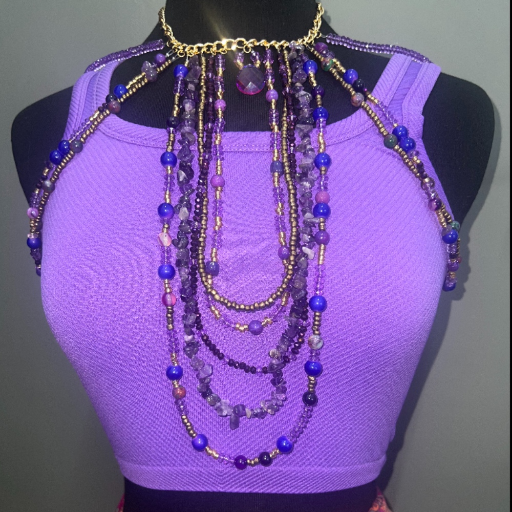 Bralette délicate à porter autour des épaules, réalisée à la main en améthyste et acier inoxydable or, symbole de sérénité et féminité. Inspirée du tekhmal marocain et des bijoux d’épaules modernes, chaque perle est assemblée pour créer une pièce unique et spirituelle.
