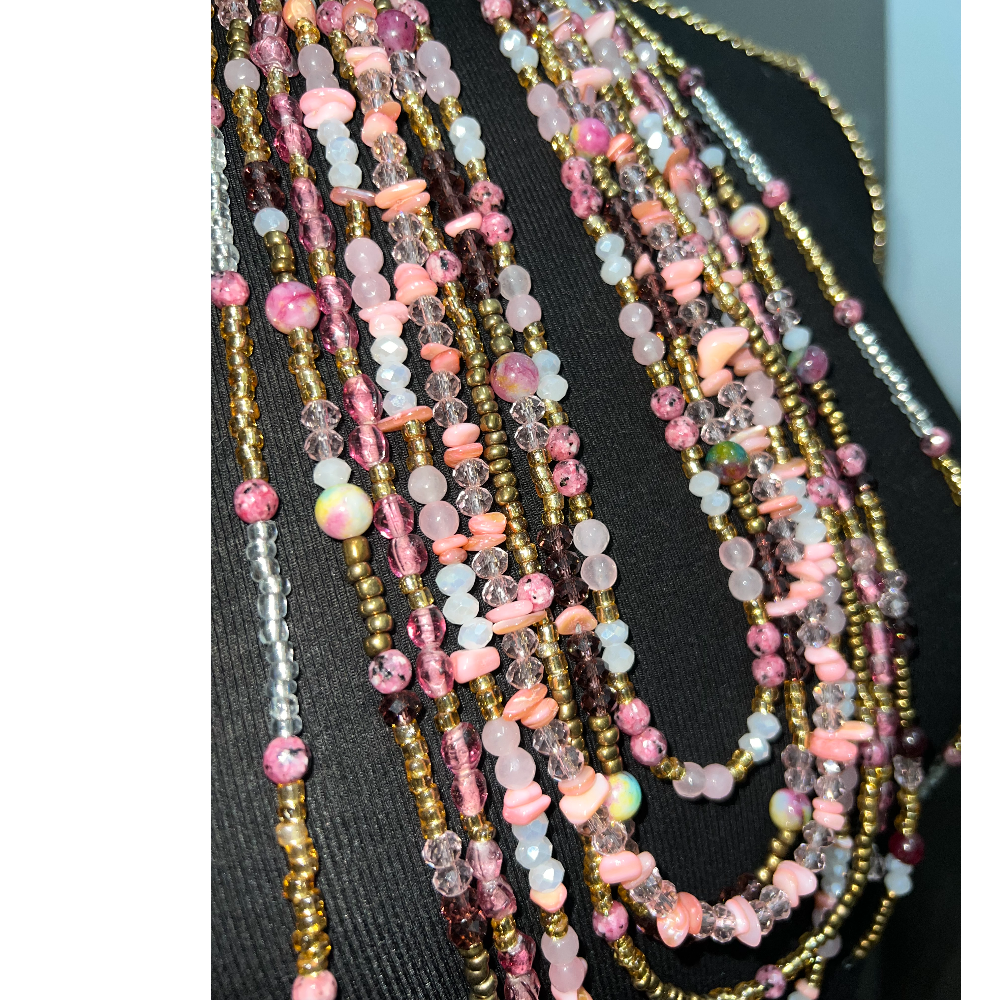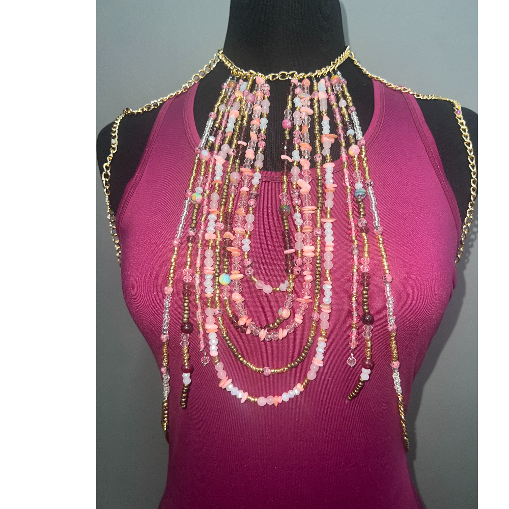 Bralette douce et féminine à porter autour des épaules, réalisée à la main en rose quartz et or. Fusion parfaite entre l’élégance du tekhmal marocain et le style moderne des body chains. Le quartz rose symbolise l’amour, l’harmonie et la douceur, apportant à ce bijou-accessoire une aura romantique et lumineuse.