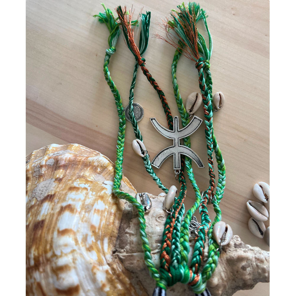 Couleur : Vert Matériaux : Fils tressés, charms berbères, coquillage cauris