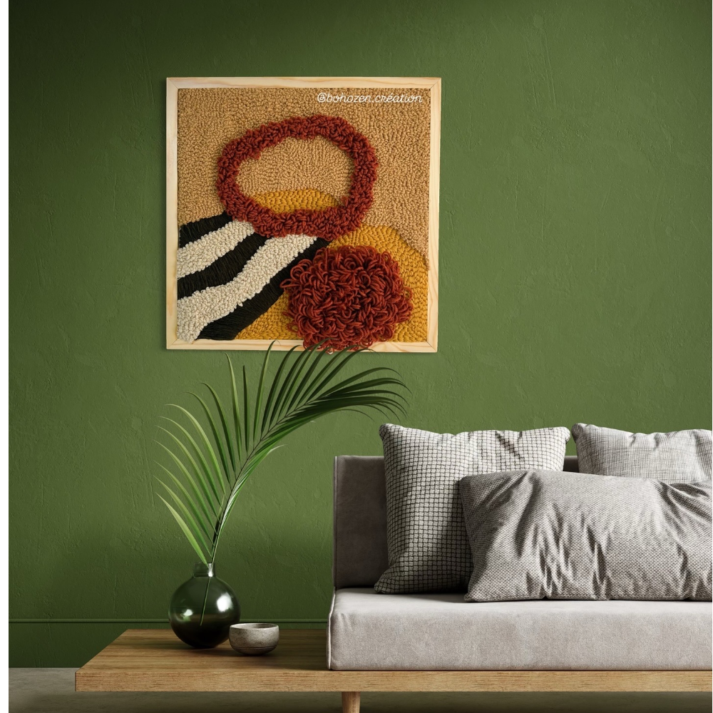 Apportez une touche chaleureuse et artistique à votre intérieur avec ce magnifique tableau mural en punch needle, entièrement fait à la main. Son design abstrait aux formes organiques et aux couleurs naturelles — ocre, terracotta, vert et beige — s’inspire du style bohème et moderne.